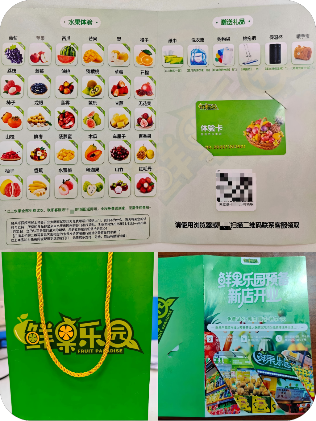 据了解,纳入预警的居民通过扫描家门口放置的“新鲜水果天堂”礼包上的二维码“扫码领取福利”。袋子内的宣传单显示,通过扫码可以获得水果品尝资格,还可以尝试纸巾、洗衣液等生活用品。然而,一旦扫码,诈骗软件就会主动联系“客服”,一步步引诱居民陷入精心设置的“陷阱”。